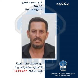 ووزع مخفر قوى الأمن الداخلي في بلدة الطيبة صوراً للجاني للاتصال بمخفر الطيبة عن من يعرف عنه شيئاً للاتصال على الرقم.