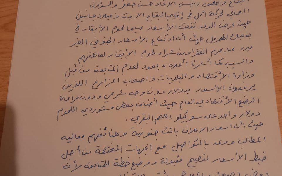زار وفد من اتحاد النقابات والمستخدمين في محافظة بعلبك – الهرمل معالي وزير الزراعة الدكتور عباس الحاج حسن بحضور رئيس واعضاء نقابة مستخدمي وبائعي اللحوم في البقاع و حضور رئيس الاتحاد حسن جعفر والمسؤل العمالي لحركة امل في اقليم البقاع ميلاد جانبين ، حيث عرض الوقد تفلت الاسعار سيما لحوم الابقار في بعلبك الهرمل حيث ان ارتفاع الاسعار سيما لحوم البقار في بعلبك الهرمل حيث ان ارتفاع الاسعار الجنوني الغير مبرر مما يحرم الفقراء من شراء لحوم الابقار لعائلاتهم والسبب كما اشرنا اعلاه يعود لعدم المتابعة من قبل وزارة الاقتصاد والبلديات واصحاب المزارع الذين يرفعون الاسعار بالدولار دون وجه شرعي ودون مراعاة الوضع الاقتصادي العام حيث أضاف بعض مستوردي اللحوم دولار واحد على سعر كيلو اللحم البقري .