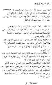 بعد إجتماع عشيرة آل رباح صباح يوم السبت في ١٢/٣/٢٠٢٢ في منطقة بعلبك و بعد أن تداولت بالحادث المؤلم الذي تعرض له الشاب الجامعي المأسوف على شبابه المظلوم غابي حسن رباح يوم أمس قررت الآتي :