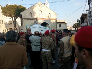 وبعد القداس الالهي لراحة نفس الشهيد حمل النعش الذي لف بالعلم اللبناني رفاق السلاح، فيما قدمت ثلة من الجيش التحية العسكرية للشهيد على لحن نشيد الموت.