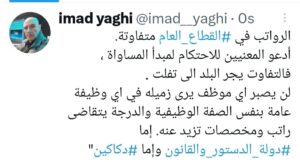 غرد رئيس اللقاء الوطني للعاملين في القطاع العام عماد ياغي على تويتر قائلا: