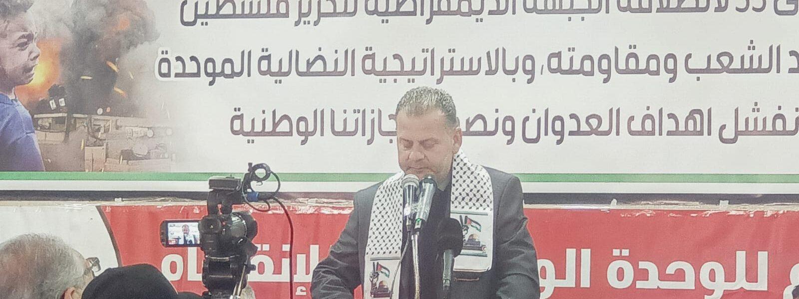 وألقى عضو اللجنة المركزية للجبهة الديمقراطية لتحرير فلسطين عبدالله كامل أكد فيها أن هناك وحدة في الميدان ووحدة في شعبنا تقف خلف مkاومته وان دماء الشهداء التي تسقط ستفتح لنا ابواب العبور الى الحرية والاستقلال والعودة.