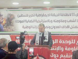 وأشار خلال المهرجان السياسي التضامني الذي اقامته الجبهة الديمقراطية لتحرير فلسطين بمناسبة الذكرى ال 55 لانطلاقتها ودعما لصمود الشعب الفلسطيني ومقاومته الباسلة انه بالرغم من المجازر الذي يرتكبها العدو الإرهابي، الا ان المقاومة تسطر أعظم ملاحم البطولة التي لا مثيل لها في التاريخ، كما يسطر الشعب الفلسطيني المضحي أروع ملاحم الصمود والتشبث بأرضه ومقاومته.