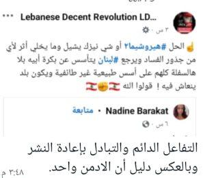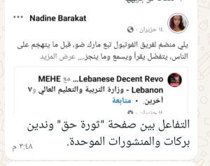 تدير بركات عدة صفحات نذكر منها : Nadin Barakat و Lebanese Decent Revolution _ LDR ثورة الحق ، والعلاقة بين الصفحتين واضحة جدا لجهة تطابق المنشورات والأفكار والمحتوى ولوجود تعاون بإعادة النشر بين الأولى للثانية والعكس ( صورة مرفقة لكل منهما).
