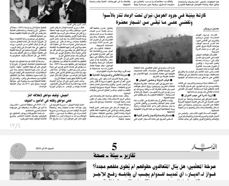 من جهته، شكر علي نديم ناصر الدين قيادة الجيش والدفاع المدني على تدخلهما، لكنه طالب الدولة بإعادة تأهيل وتشجير المنطقة، معتبرًا أن ما حصل جرس إنذار كبير لا بد أن يُترجم بخطط عملية عاجلة