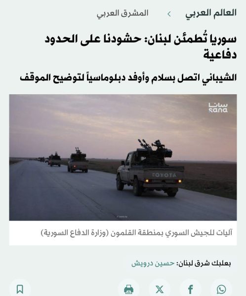 نفى مصدر رسمي لبناني أن تكون الحشود العسكرية التي دفعت بها سوريا إلى الحدود، تستهدف لبنان، مؤكداً أن هذه الحشود «هي لحماية سوريا وليست للهجوم على لبنان»، وسط تنسيق بين الجيشين اللبناني والسوري، وطمأنة سورية بأن انتشار الوحدات يشمل الحدود مع لبنان والعراق، «في إطار إجراءات دفاعية احترازية تهدف إلى ضبط الحدود، وتعزيز الأمن، في ظل التطورات الإقليمية الراهنة، وازدياد محاولات التهريب».