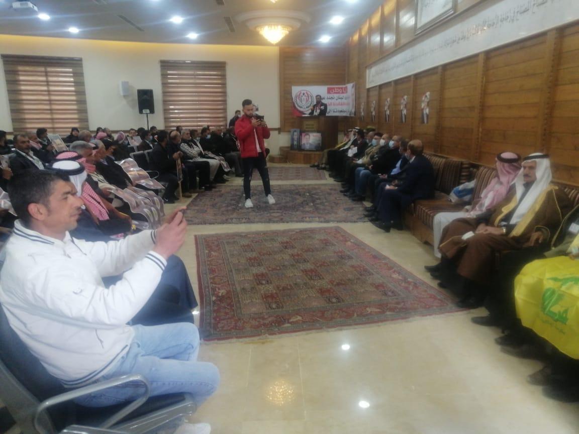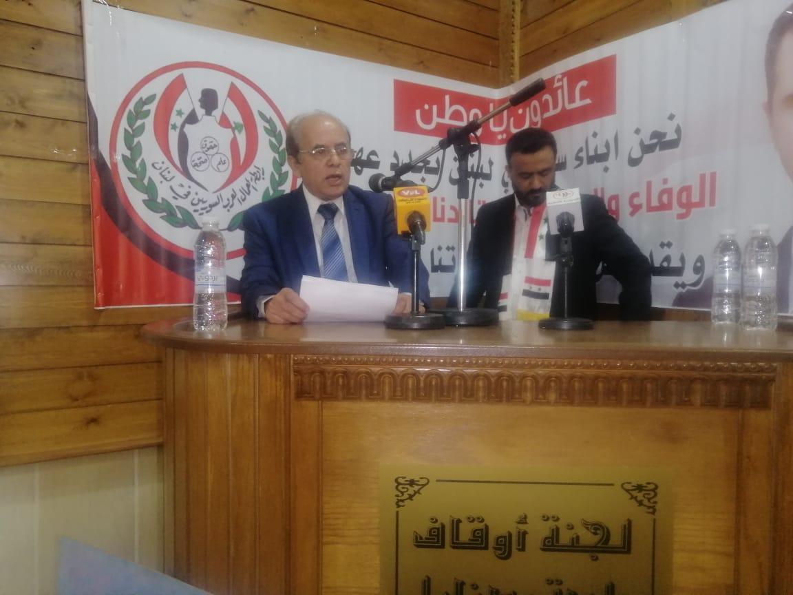 توجه بكلمة للحضور، فيما يقول عنكم البعض نازحين ولاجئين، فأننا نفضل ان نخاطبكم بكلمة مقيمين، كما قال الرئيس الأسد عنا نحن شعب واحد في بلدين، وهذا ليس بترتيب منا، لكنه من صنع الله، فالمسألة طبيعية في ان نلتقي بهدف التنسيق والتواصل من أجل مهمة وطنية عظيمة بعدما تكشفت المؤامرات ونوايا الاعداء بتقسيم سوريا واضعاف نفوذها واضعاف نفوذ الفلسطينيين وخط الممانعة والمقاومة، والعروبة والاسلام الحنيف، وقد وضعنا امام خيار وحيد وهو النصر، وقد انتصرنا واصبح الانتصار خلفنا وانتهى الأمر، وقبل ان نعلن الانتصار ذهب بعض الأعراب إلى التطبيع لقطع الطريق علينا للاحتفال بالنصر الكبير