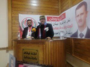 ودعا الحضور من أجل تثبيت ولائهم للوطن ولمبادئه من خلال الاستحقاق الانتخابي لرئاسة الجمهورية العربية السورية، لنعلن النصر النهائي على كل أشكال العدوان ومن اجل تحطيم كل اصفاد العقوبات وسلاسل الظلم والحصار