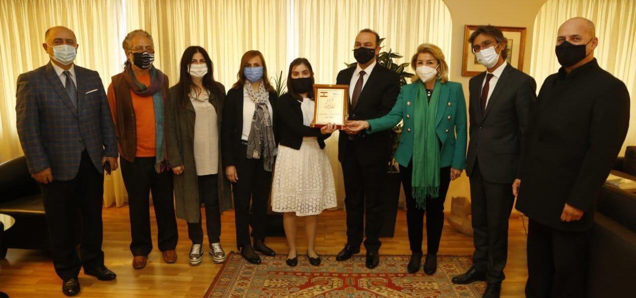 التكريم حضره رئيس مجلس الإدارة والأعضاء في المعهد الوطني العالي للموسيقى الكونسرفتوار، حيث قدم الوزير درعا تقديريا للمناسبة.