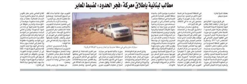 على طريق بيروت – البقاع نحو شرق لبنان، ارتفعت لافتة يطالب فيها مثبتوها الدولة اللبنانية بإطلاق معركة «فجر الحدود»، لضبط معابر التهريب مع سوريا، أسوة بمعركة «فجر الجرود» التي أطلقها الجيش اللبناني في أغسطس (آب) 2017، وأسفرت عن تطهير المنطقة الحدودية من عناصر تنظيم «داعش» المتطرف.