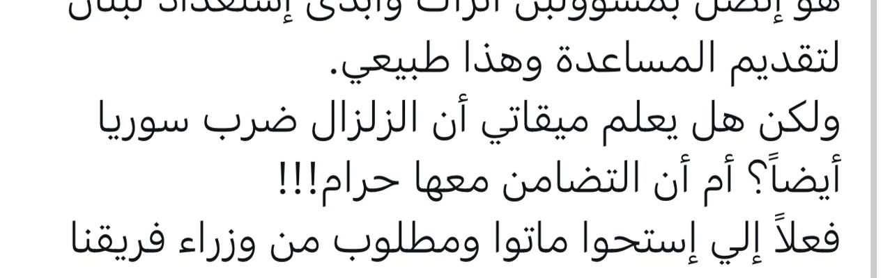 تغريدة لافتة لحجازي : في كل مرة يثبت نجيب ميقاتي أنه جبان من الطراز الرفيع. هو إتصل بمسؤولبن أتراك وأبدى إستعداد لبنان لتقديم المساعدة وهذا طبيعي. ولكن هل يعلم ميقاتي أن الزلزال ضرب سوريا أيضاً؟ أم أن التضامن معها حرام!!!…